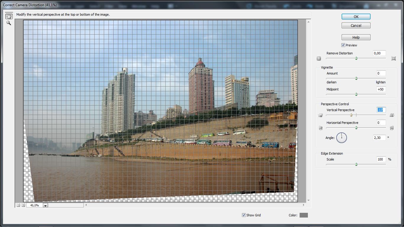 I Photoshop Elements kan styrtende linier og andre linier justeres, hvis man går ind i Filter - Correct Camera Distortion.
