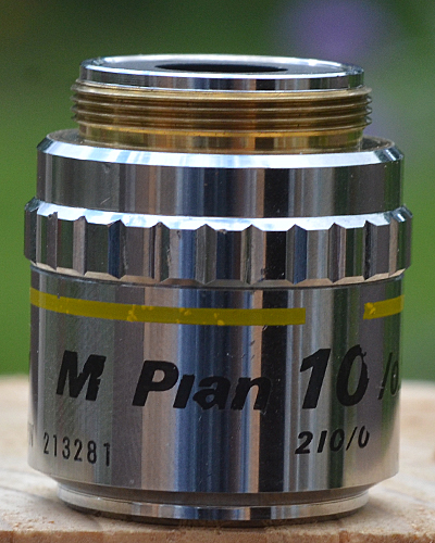 | Nikon mikroskop objektiv CF M Plan 10X SLWD. M står for metallurgisk, SLWD står for super long working distance. 210 betyder, at det er beregnet til mikroskoper med en rørlængde på 210mm. Er optimalt i en afstand af 200mm fra kameraets filmplan. M objektiverne regnes for nogle af de bedste til fotografering. |