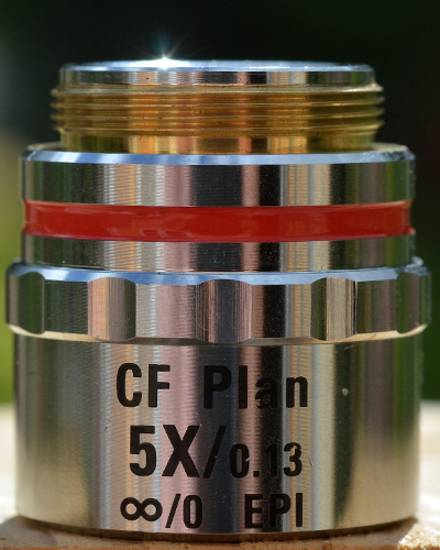 Nikon CF Plan 5X infinite mikroskop objektiv. Uendelighedstegnet/0 betyder det er et infinite objektiv, hvorfor det skal påsættes et teleobjektiv på godt 200mm for at opnå den optimale korrektion for kromatisk aberration. Dette gælder for Nikons DX format. WD står for working distance, der her er 22,5mm. EPI betyder at objektivet er beregnet til en bestemt belysnings teknik. Det har ingen betydning for objektivets anvendelse til fotografi. |