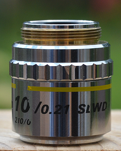 | Nikon mikroskop objektiv CF M Plan 10X SLWD. M står for metallurgisk, SLWD står for super long working distance. 210 betyder, at det er beregnet til mikroskoper med en rørlængde på 210mm. Er optimalt i en afstand af 200mm fra kameraets filmplan. M objektiverne regnes for nogle af de bedste til fotografering. |