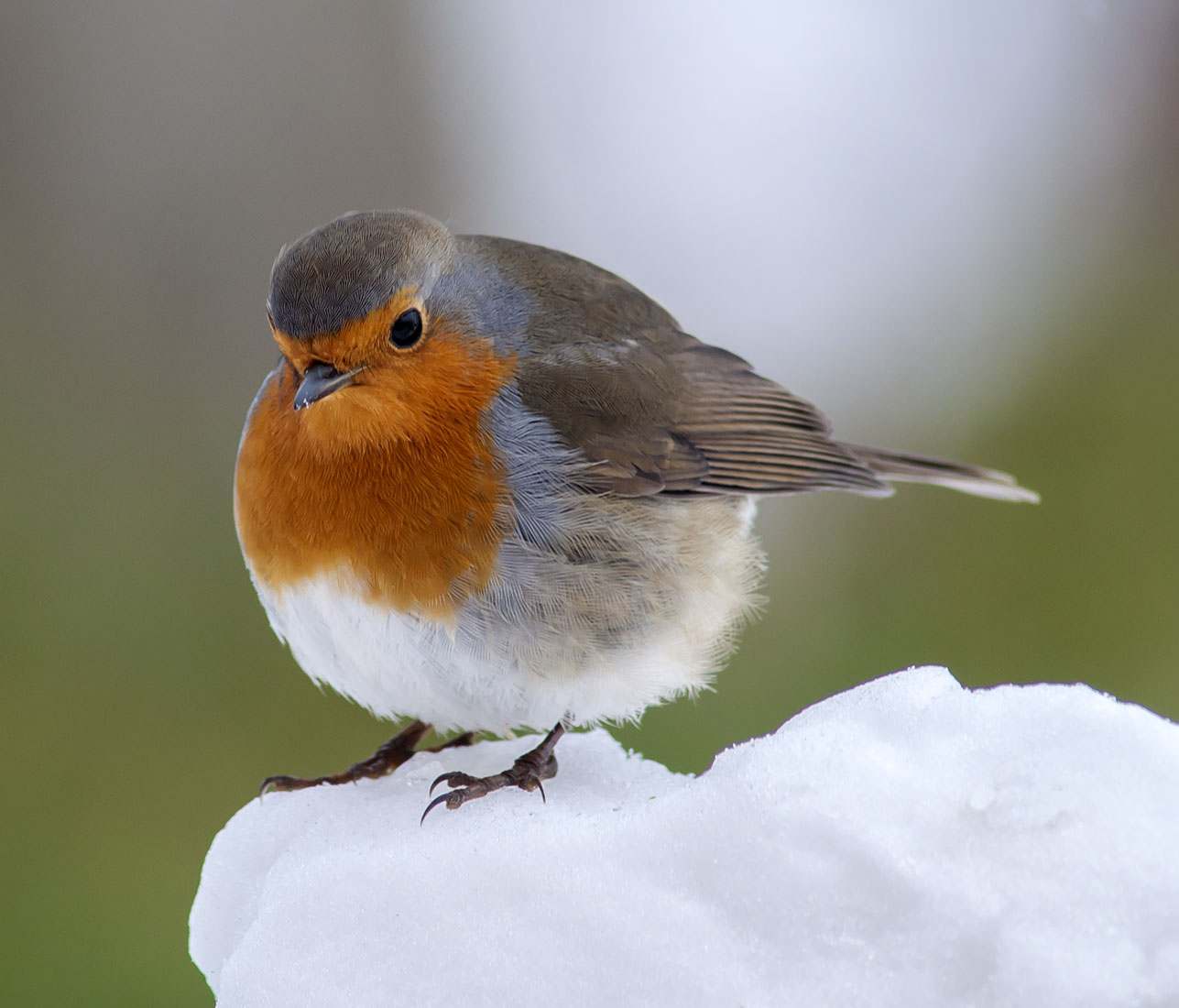European Robin in the snow (Erithacus rubecula).