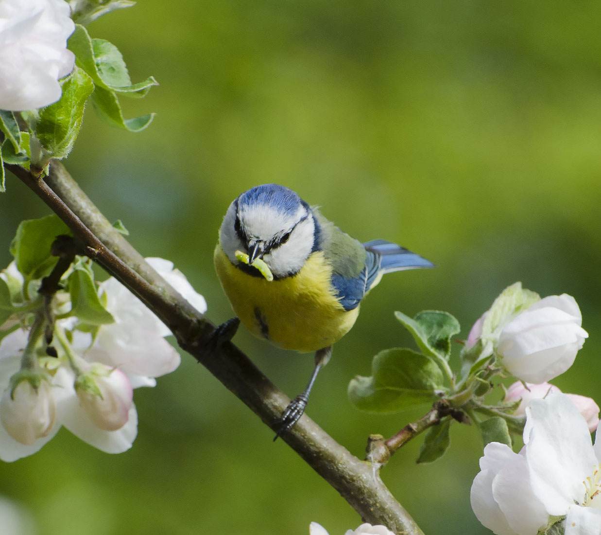 Eurasian Blue Tit with larvae from apple blossom (cyanistes caeruleus or parus caeruleus).