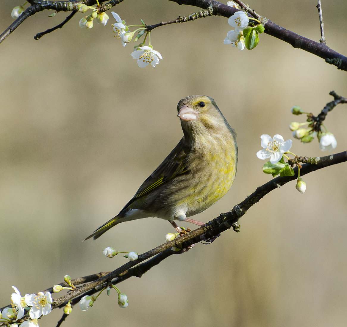 Female Greenfinch in flowering mirabelle (Carduelis chloris).