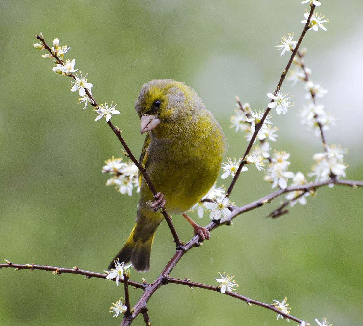 European Greenfinch in flowering blackthorn bush (Carduelis chloris).